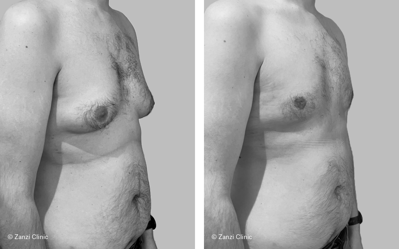 Les photos avant/après réalisées après l’intervention du Dr Michele Zanzi, Spécialiste FMH en Chirurgie Plastique, Reconstructive et Esthétique à la Zanzi Clinic de Lausanne, montrent une réduction nette du volume sous-aréolaire, une amélioration de la symétrie thoracique et un contour pectoral plus masculin. Les cicatrices, placées dans la transition aréolaire, deviennent presque invisibles après quelques mois.