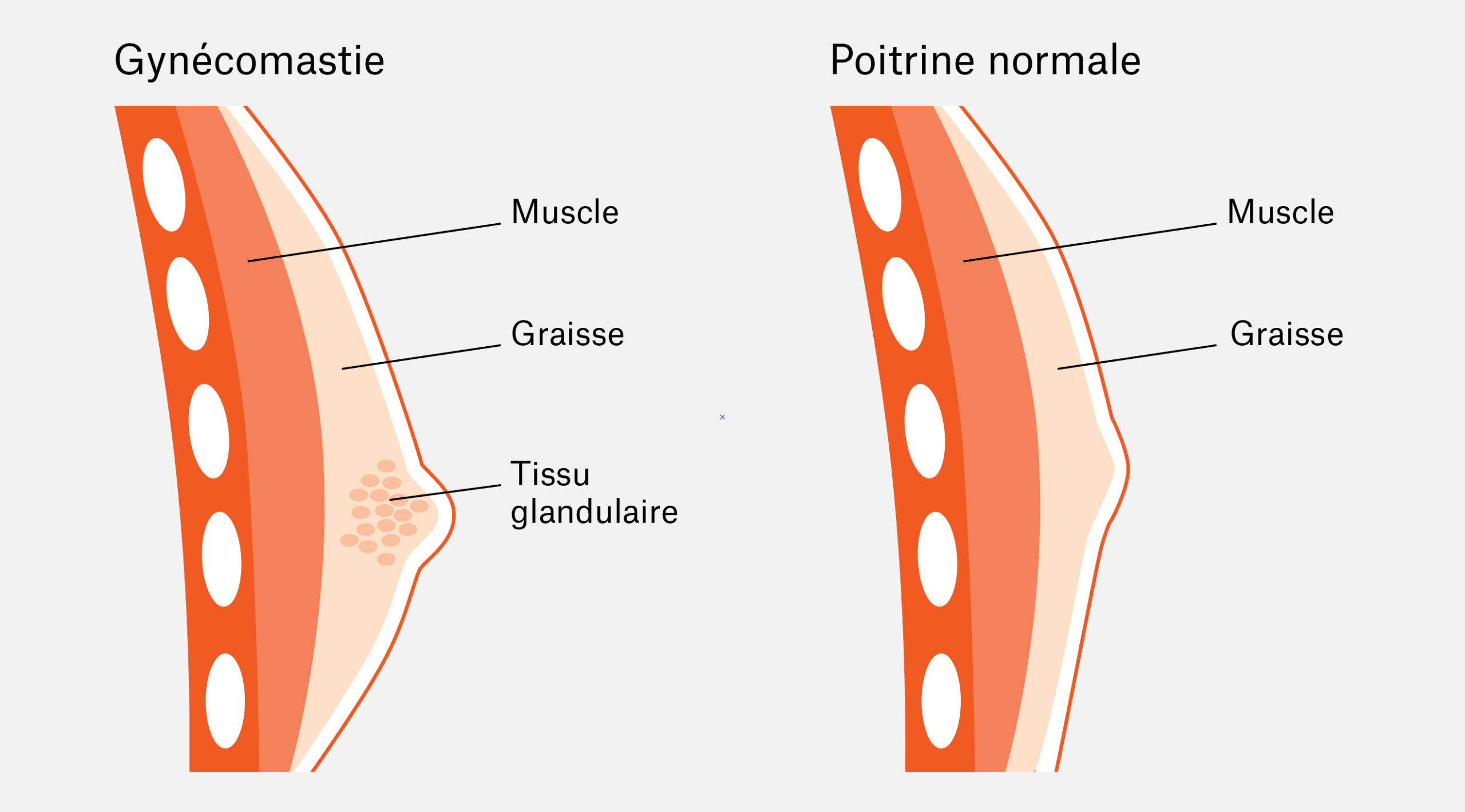 Du point de vue des endocrinologues, elle résulte d’un déséquilibre entre testostérone (hormone masculine) et œstrogènes (hormone à action féminisante). Lorsque les œstrogènes dominent localement, la glande mammaire se développe au niveau des pectoraux.