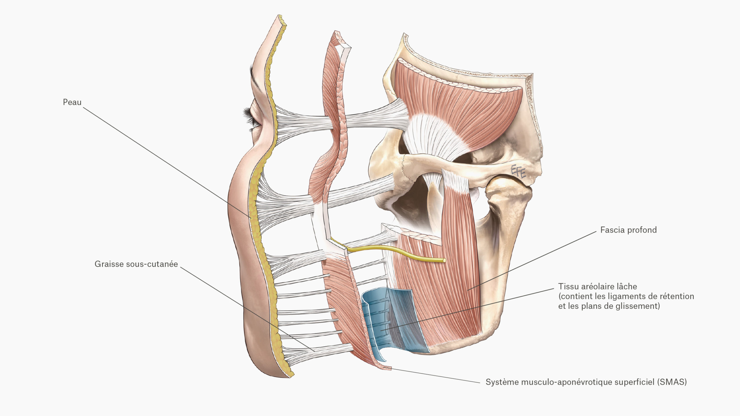 Le lifting agit en profondeur: le chirurgien repositionne les muscles du système musculo-aponévrotique superficiel (SMAS) après un décollement en profondeur, retend la peau et redessine l’ovale du visage sous anesthésie générale sans figer les expressions.